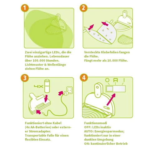 Die myFleaTrap Flohfalle arbeitet mit zwei Flöhe-anziehenden LED-Leuchten. Das Lichtmuster und die Wellenlänge locken die Flöhe an. Sobald die Flöhe in der Falle ankommen, landen sie auf einer Klebefolie, auf der sie dauerhaft festkleben. Jede Klebefolie ist in der Lage, durchschnittlich 10.000 Flöhe zu fangen. Die Folien haben einen garantierten Klebeeffekt bis zu 6 Wochen nach dem Öffnen. In der Lieferung des myFleaTrap sind 2 klebende Folien mit inbegriffen.
